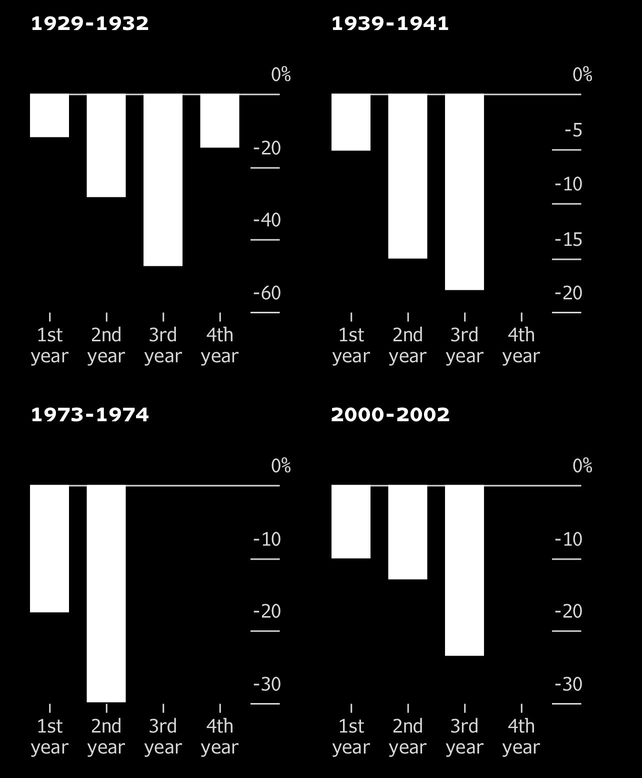 More than two back-to-back years in the red are even rarer. The S&P 500 tumbled for three straight years from 2000 to 2002 and from 1939 to 1941, while the longest losing streak remains the aftermath of the infamous Wall Street crash, when stocks fell for four years from 1929 to 1932.”—Bloomberg
