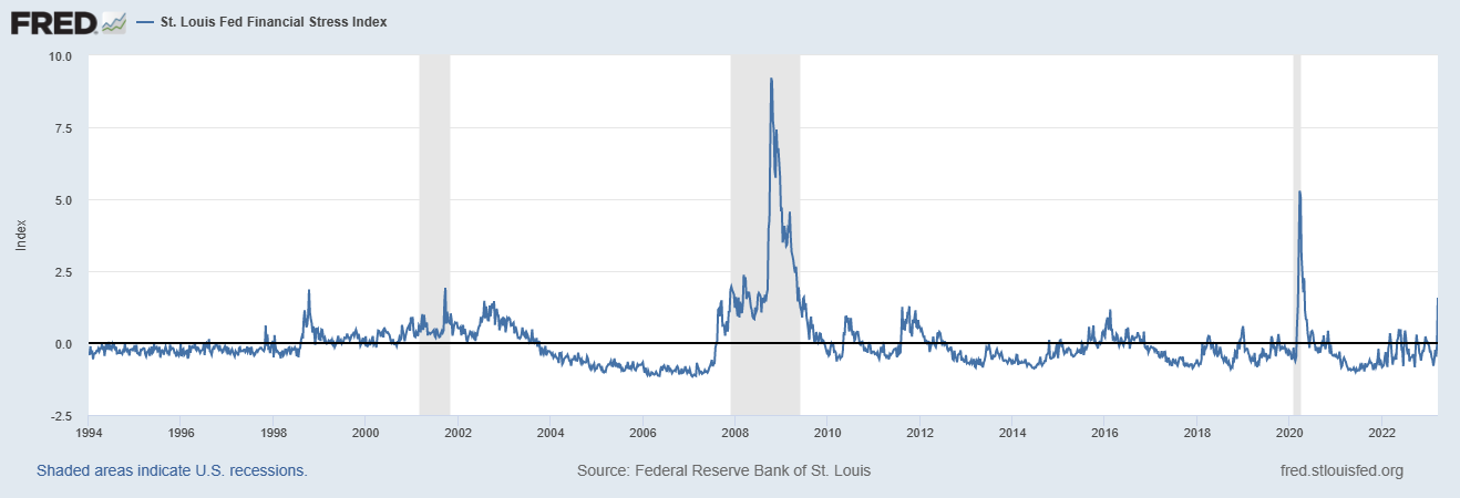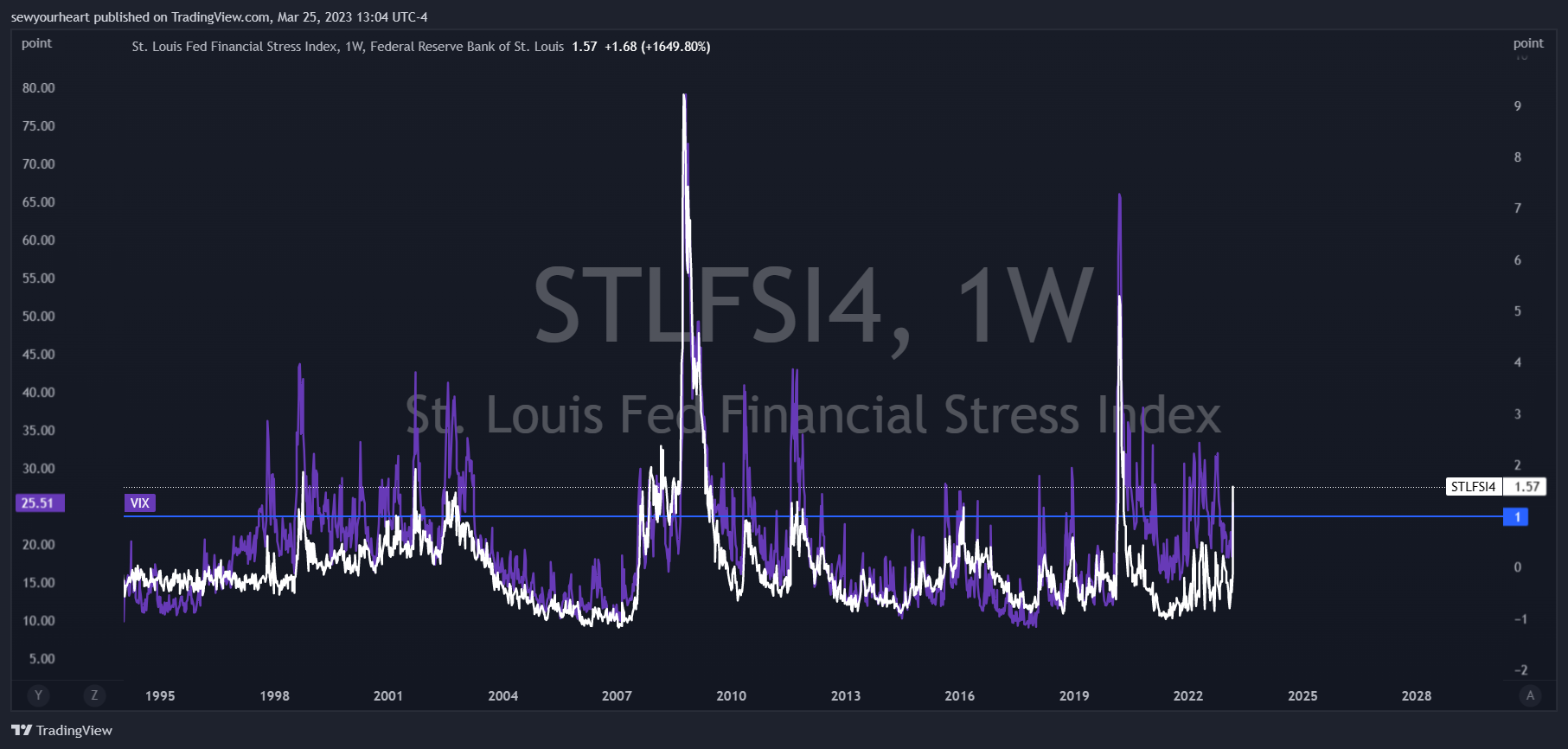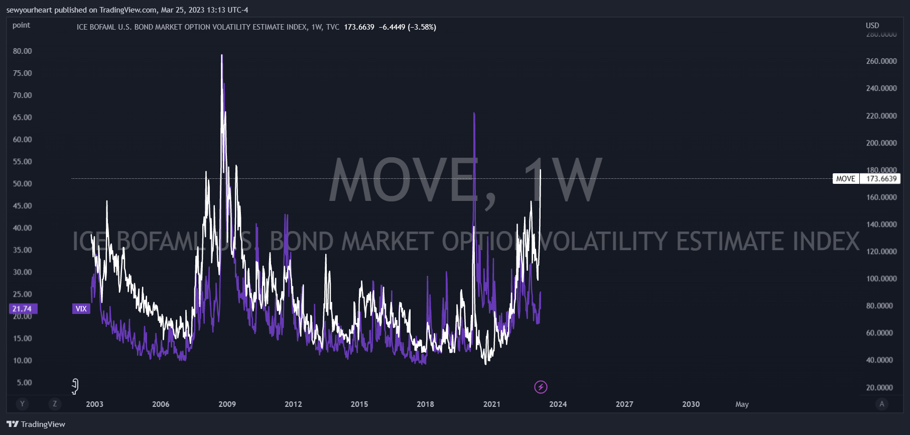 Admittedly, I’ve deliberated a lot about the present accuracy of the bond market because of both response lag and the banking crisis. If there is a systemic credit event due to this banking crisis — which I believe is highly probable — then there would be a significant deflationary shock. My dilemma is that yields, rate vol, and credit spreads/stress indexes are all singing an entirely different tune from equities right now.