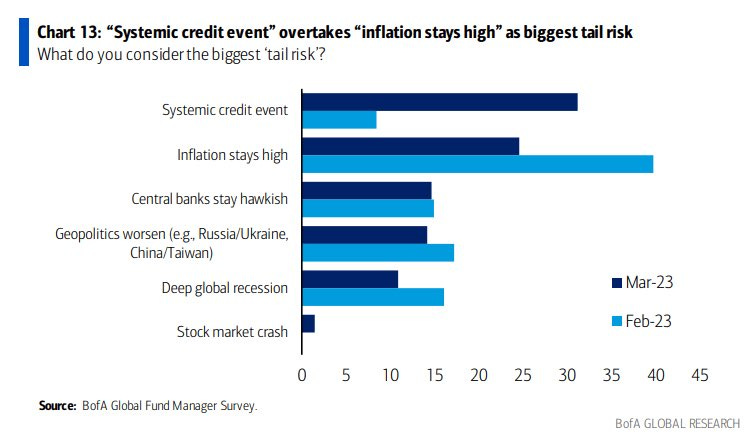 March has been eventful to say the least. The banking crisis awakened both rate and equity vol (albeit momentarily), created a plethora of new banking experts, and resurrected the “This is 2008” declarations. But the most salient development in March is the replacement of high & persistent inflation as the biggest tail risk for markets.