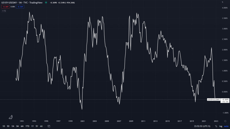 Let us not forget about the beloved 10y-3m spread. This is the more reliable leading indicator of recessions. It appears that it has now definitively inverted and a recession in 2023 looks all but inevitable.