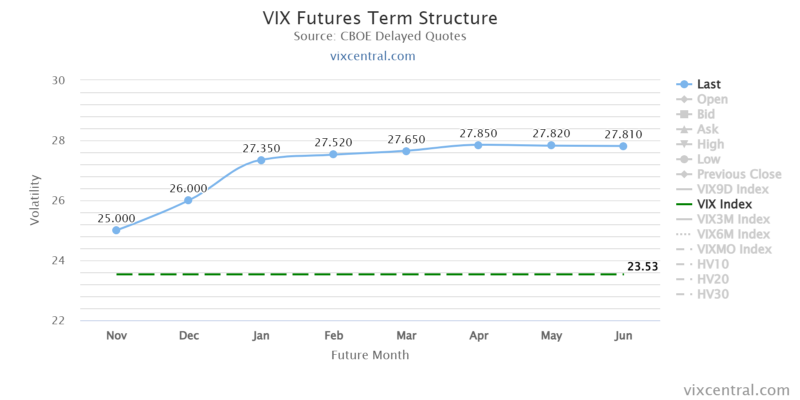 VIX’s term structure was in contango ahead of FOMC and the midterms. This is indicative of an absence of uncertainty despite this exceedingly tumultuous environment. We are in fool’s paradise. It remains in contango today.