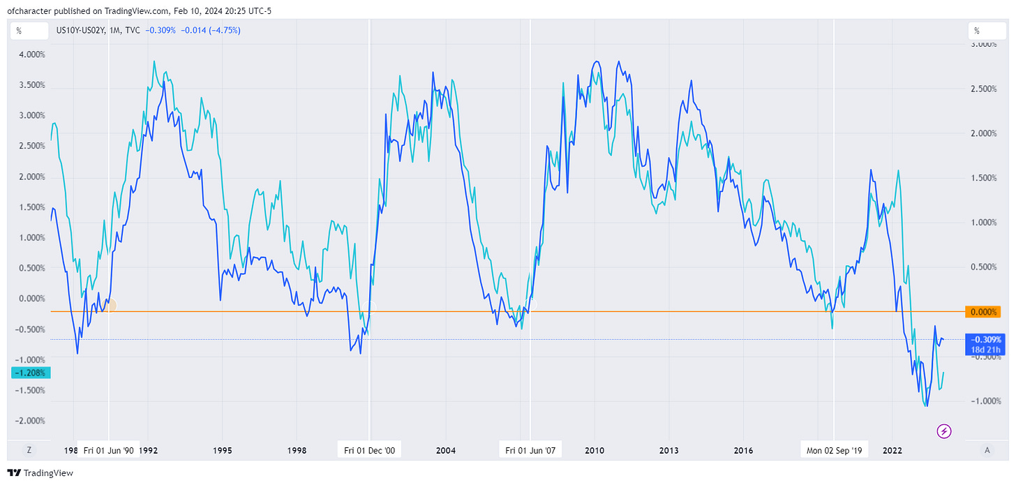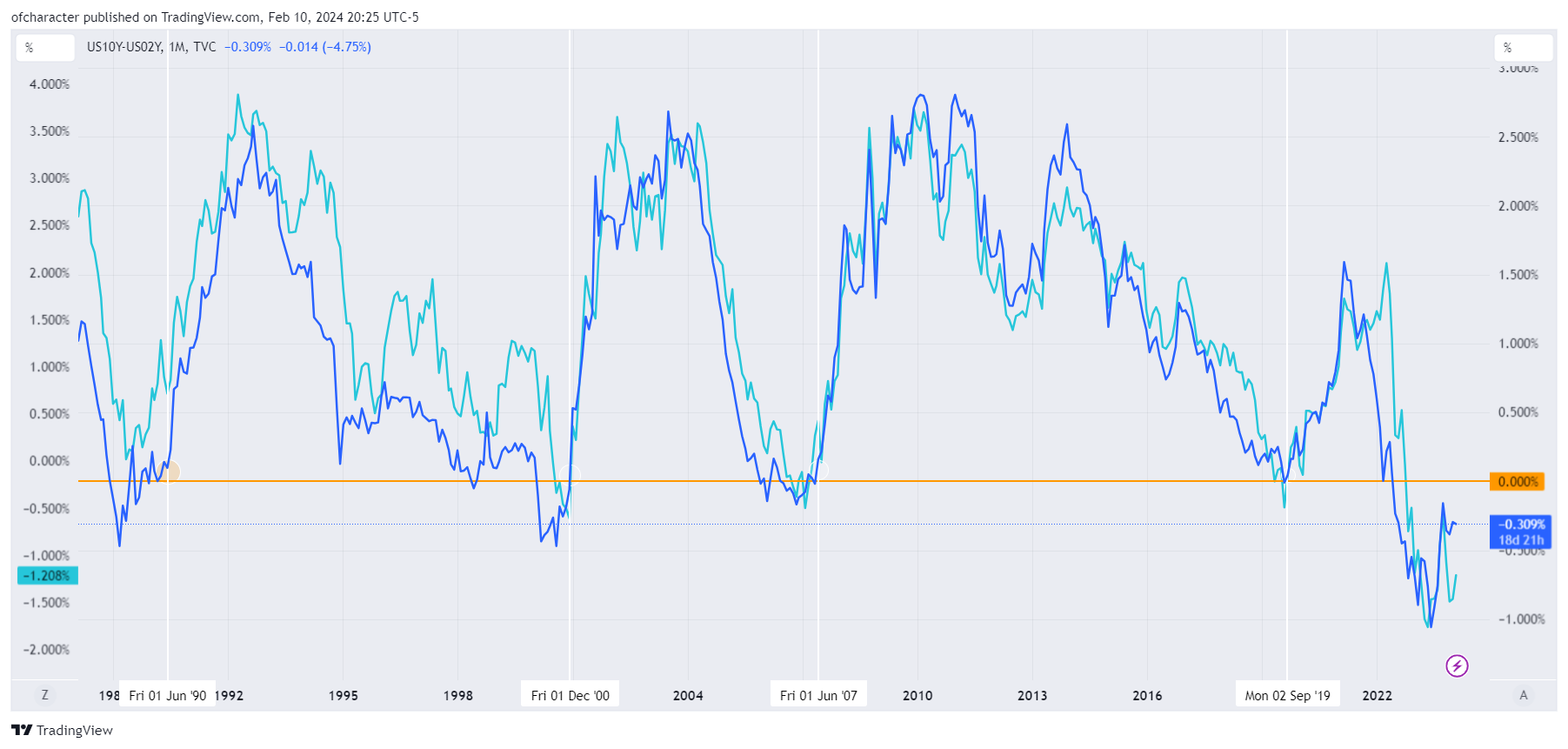 While pundits proclaim victory through soft landings, the yield curve still says that we have a ways to go before being confident on that front.