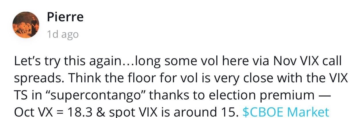 Speaking of which, I grabbed some Nov VIX call spreads on Thursday because it looked like vol had reached its (higher) floor.