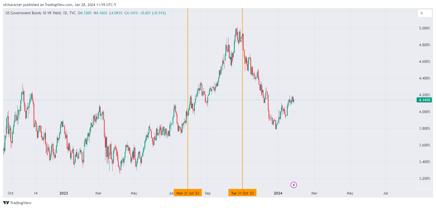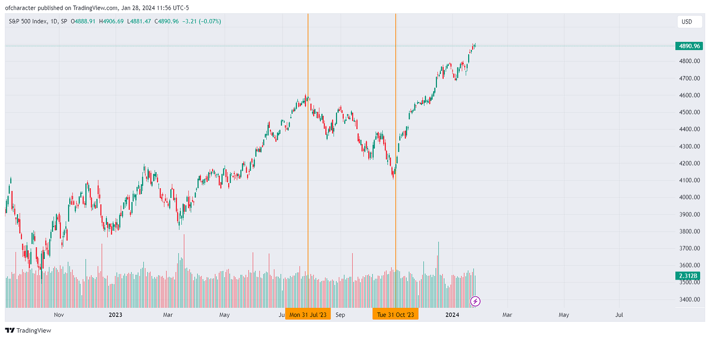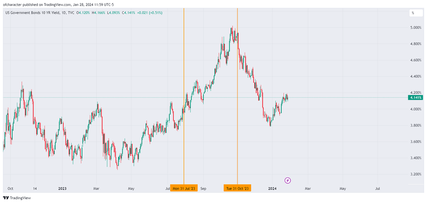 QRA estimates from the Treasury are due next week on 1/29, and the actual release is on 1/31. Remember, on 7/31 (QRA release), the bond issuance was massive relative to estimates and greatly contributed to downside in both bonds & equities. On 10/31, bond issuance was lackluster, and equities & bonds rallied aggressively. This was a major reason behind closing all of my short equity positions on Nov 1st, 2023.