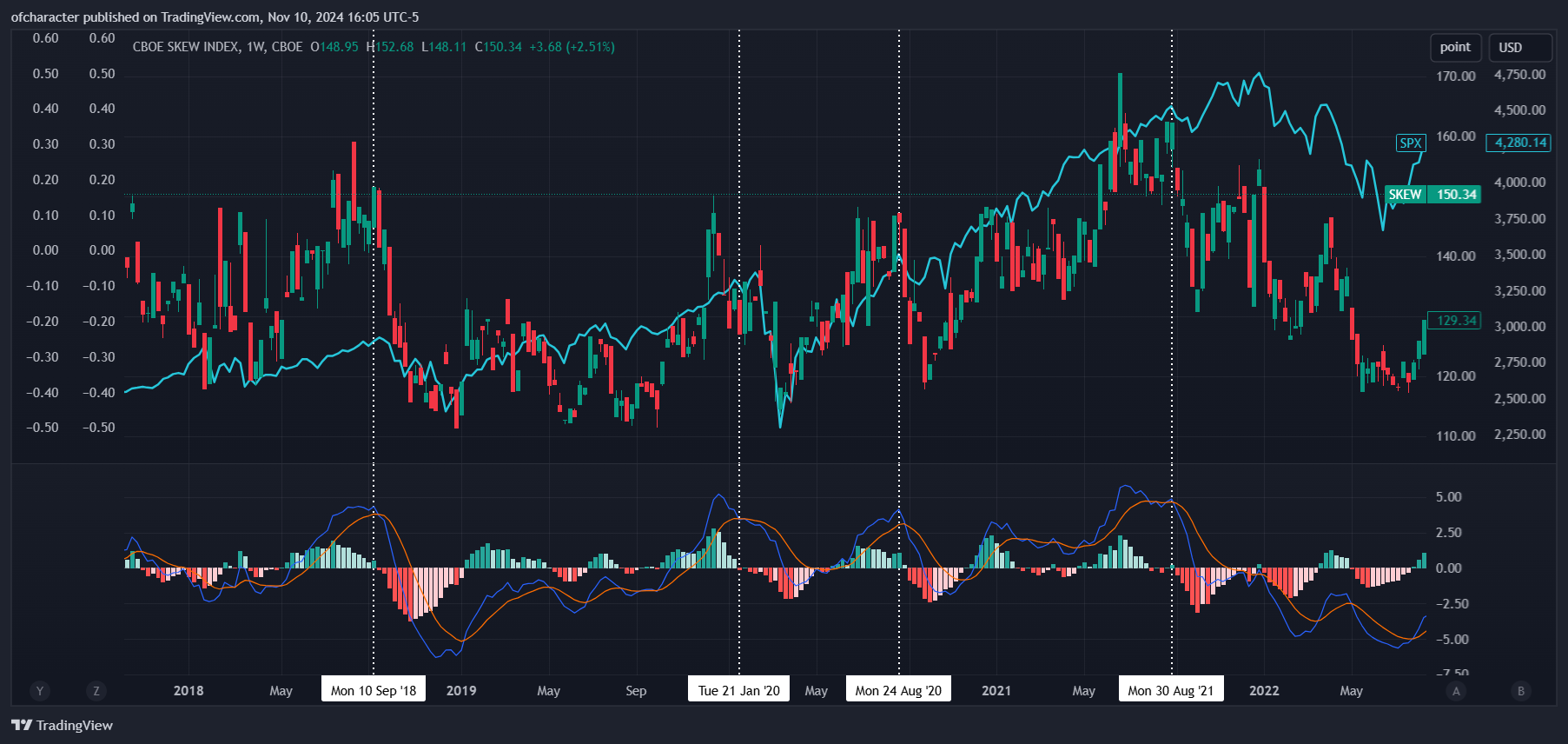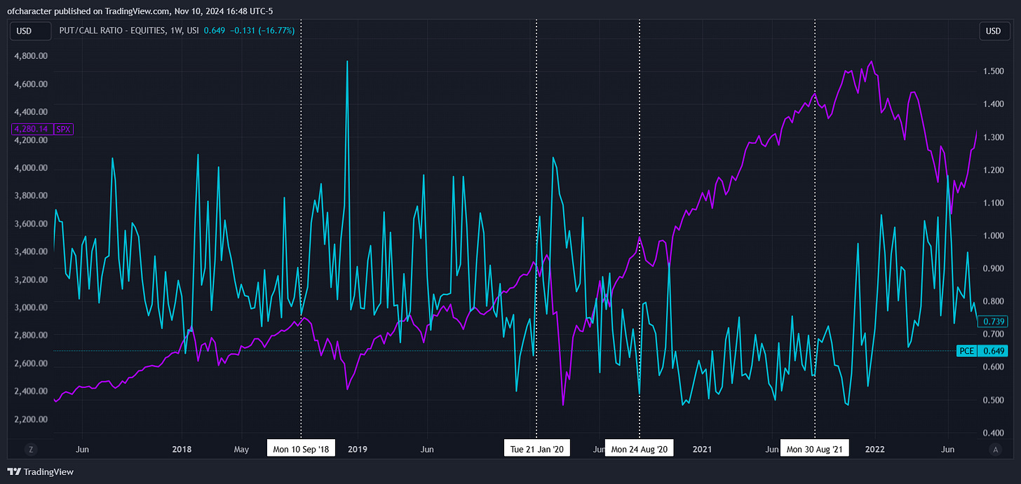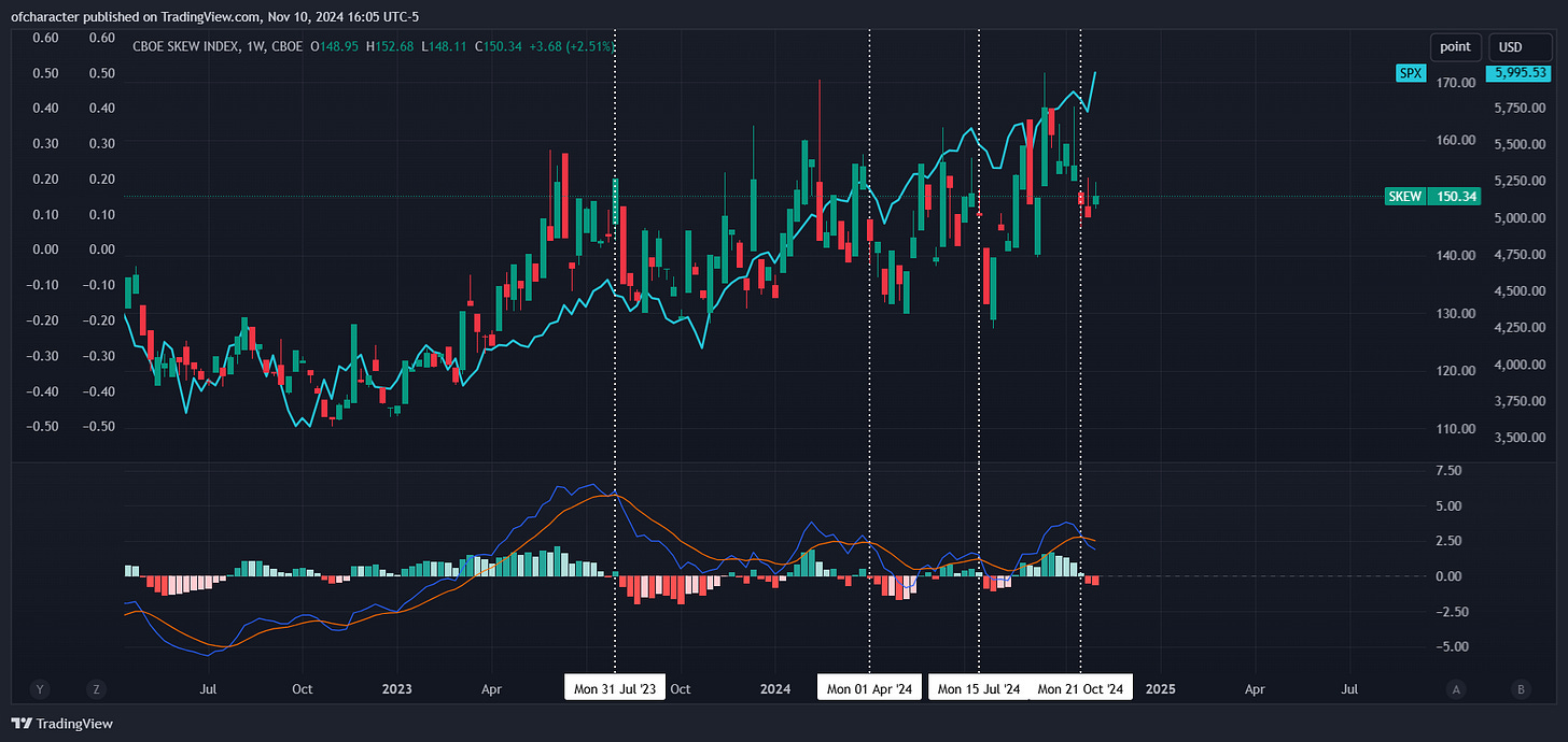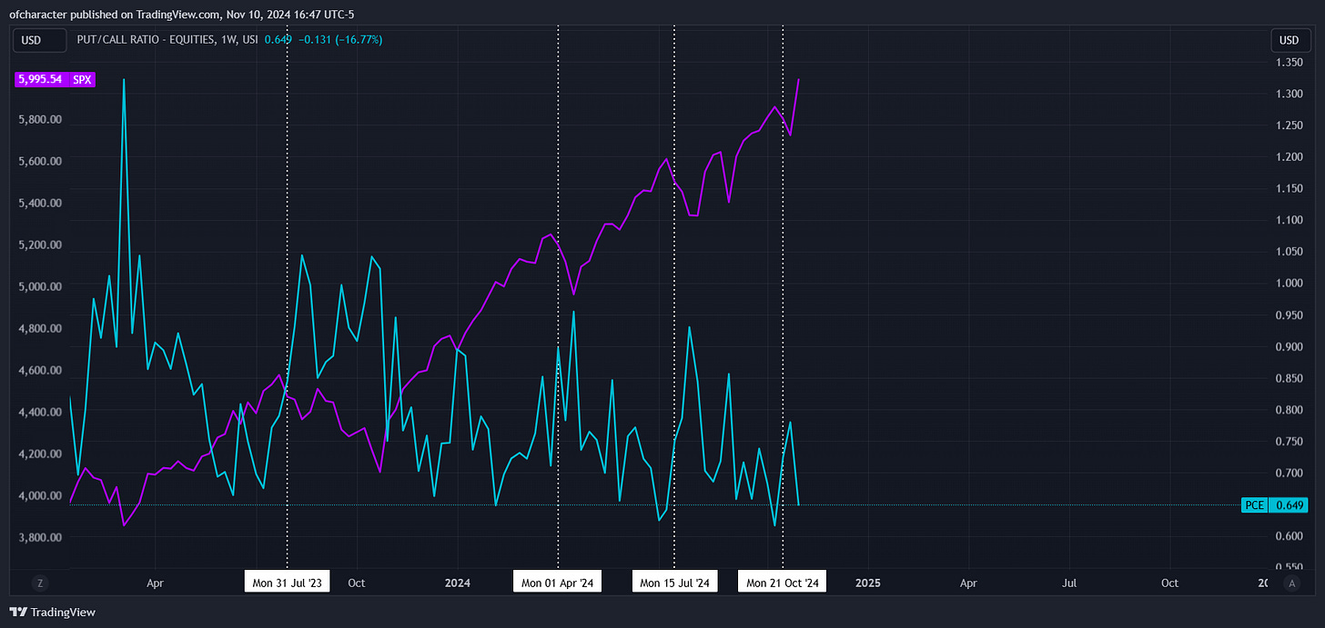 As far as favorable seasonality goes, I’m not really confident that it will be so for November. After all, this was not the case this year for April, or July. And September and October didn’t follow seasonality either. It may seem crazy to be short equities in any form right now, but aside from counter-seasonal performance & positioning, SKEW & PCE falling (ofc it can go lower) makes it feel prudent to hedge.