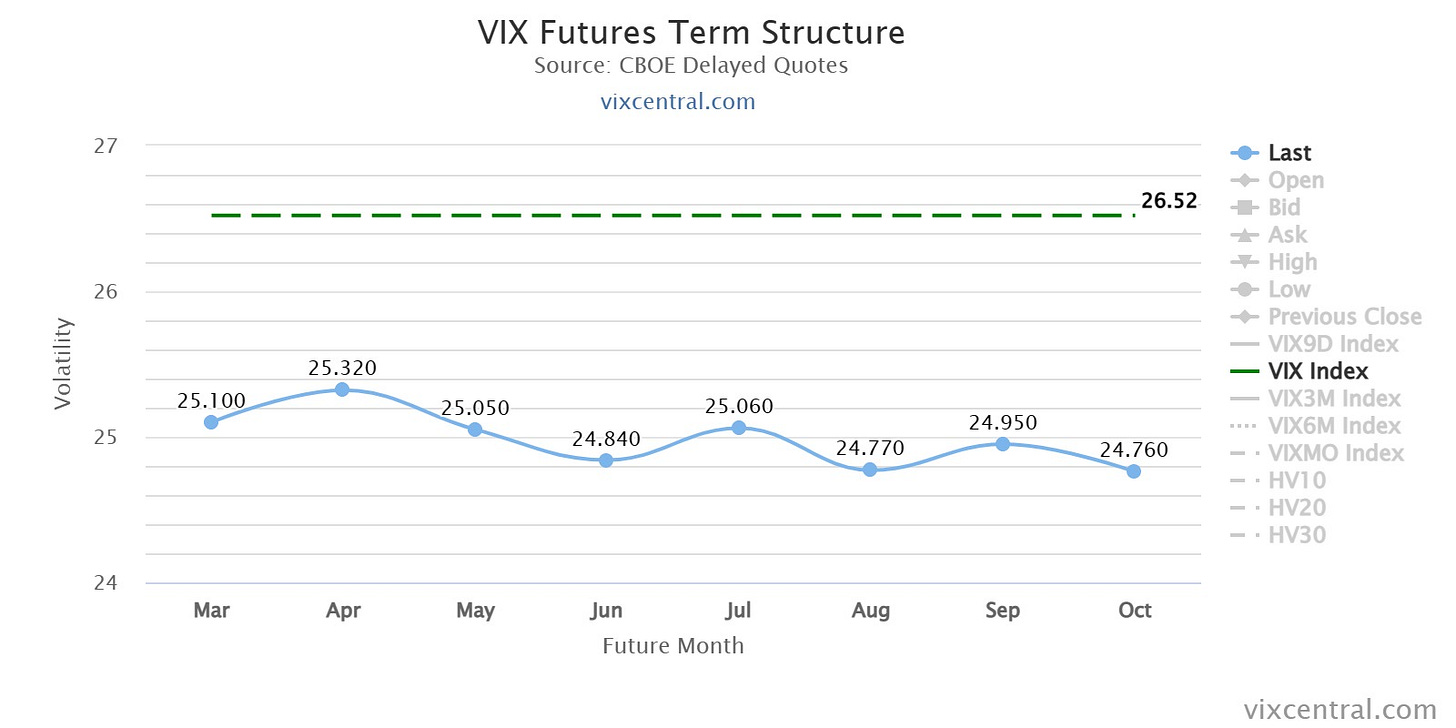 Equity vol is elevated and looks like it will continue its ascendence. The VIX TS is elevated, and the front end is almost backwardated. Also the VIX/VIX3M ratio is now 1.00.