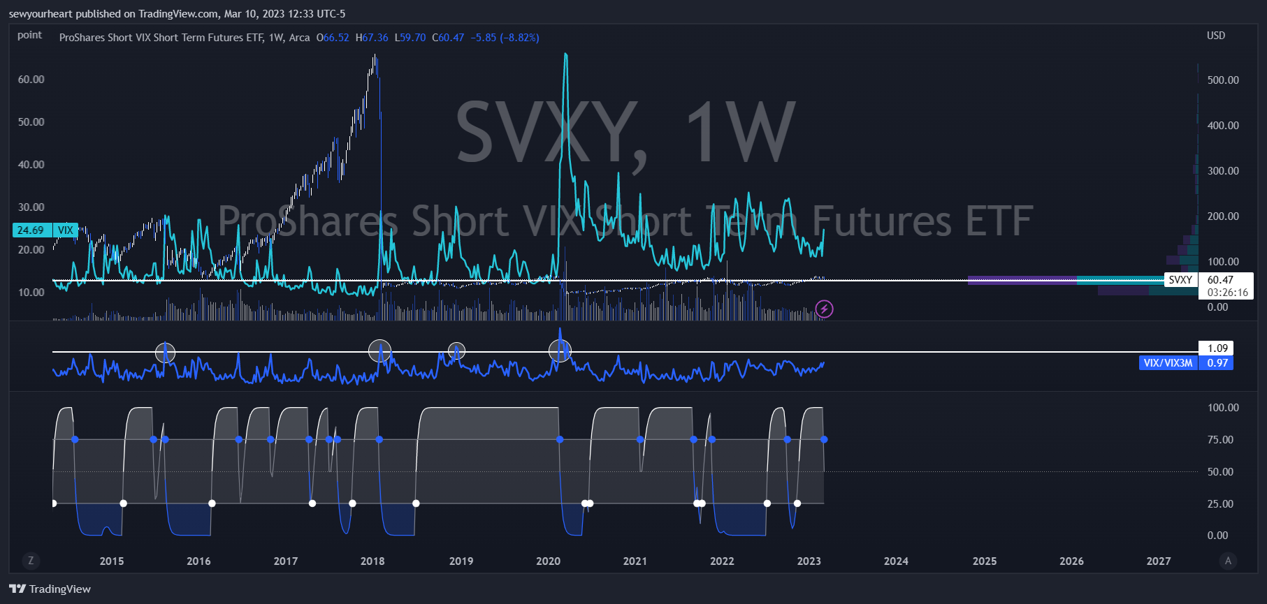 The VIX/VIX3M ratio is a great risk-off indicator. When it’s above 1.09, the chances that there will be a major selloff in equities increase, leading to an explosion in volatility. In this chart above I circled the times when the ratio crossed above 1.09 and coincided with a weekly sell signal on SVXY.