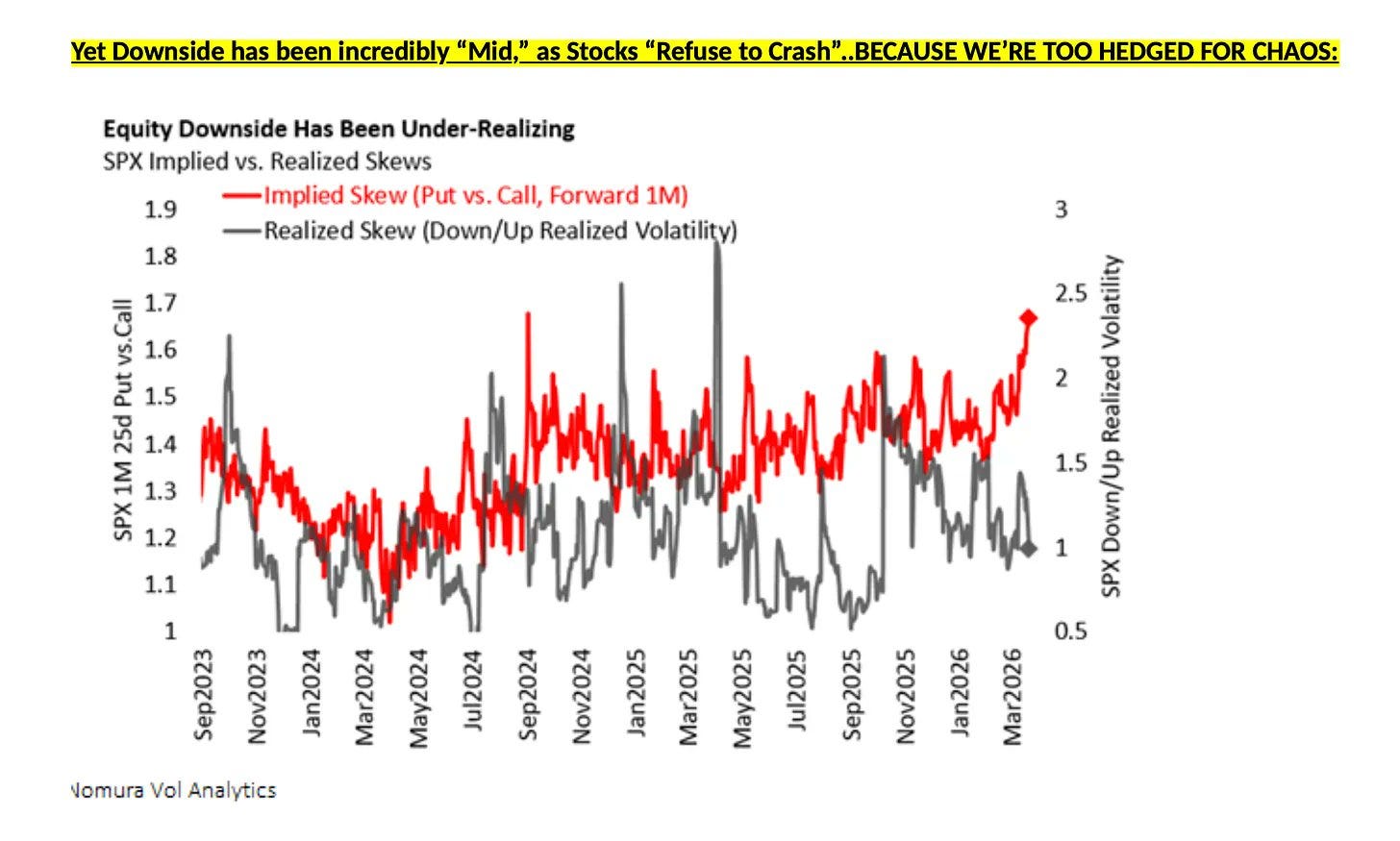 Yes, the largest energy shock in history by a mile, simultaneously affecting global food security in a major way, is exceedingly positive for US equities. Yes, but not really. The fact of the matter is that the market was simply overhedged into this crisis — hence the incredibly slow drawdown in Q1 —, so much so that any hint of a positive development out of the Middle East would send stocks flying, validity of the news be damned.