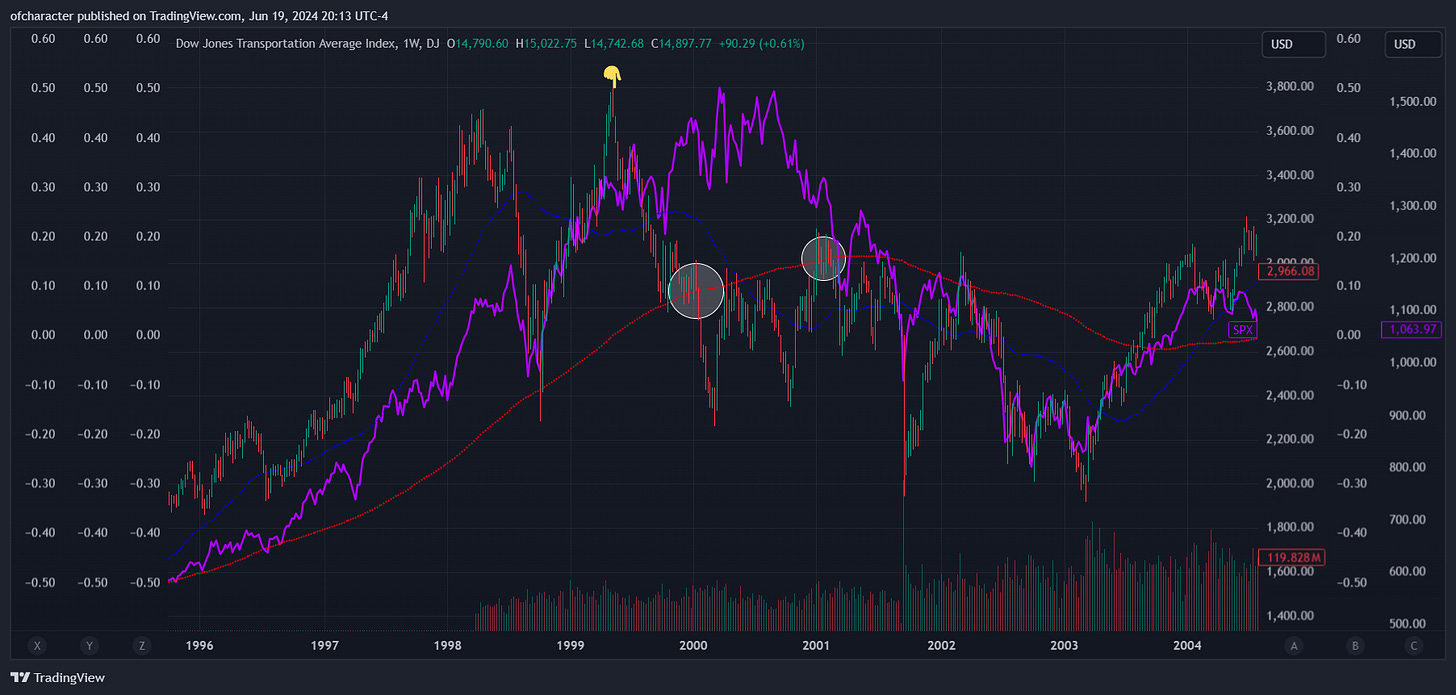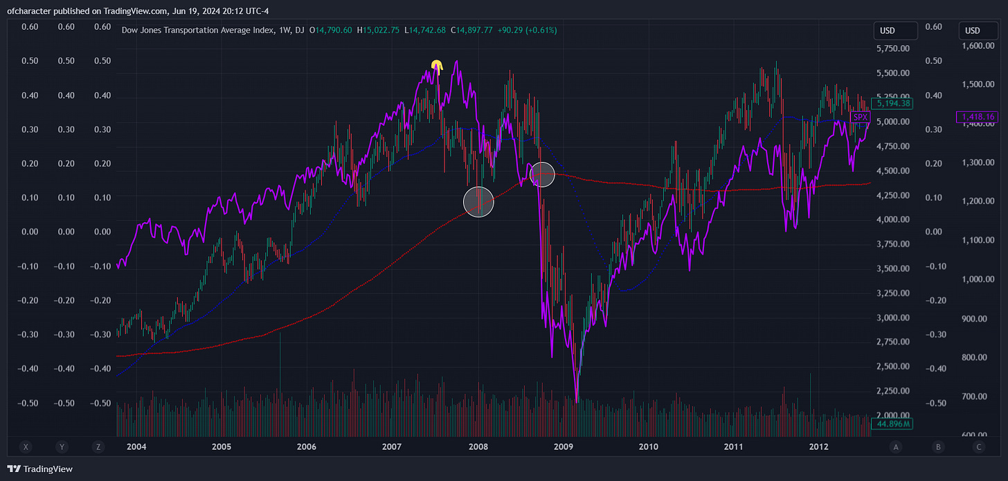 In blue & red are the weekly 50 & 200MAs respectively. Notice anything about this chart? If not, let me add some color.
