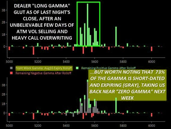 Seasonality says that only the first half of August is poor but given that this rally looks a bit long in the tooth with VIXpiration coming on August 21st, the market looks to be giving those who have missed the opportunity to take advantage of unjustifiably low cross-asset vol a second chance. Note that I don’t believe VIX will go to 65 again this time around and that the window to catch this is relatively small.