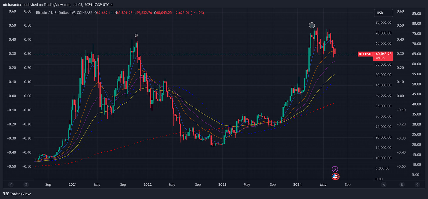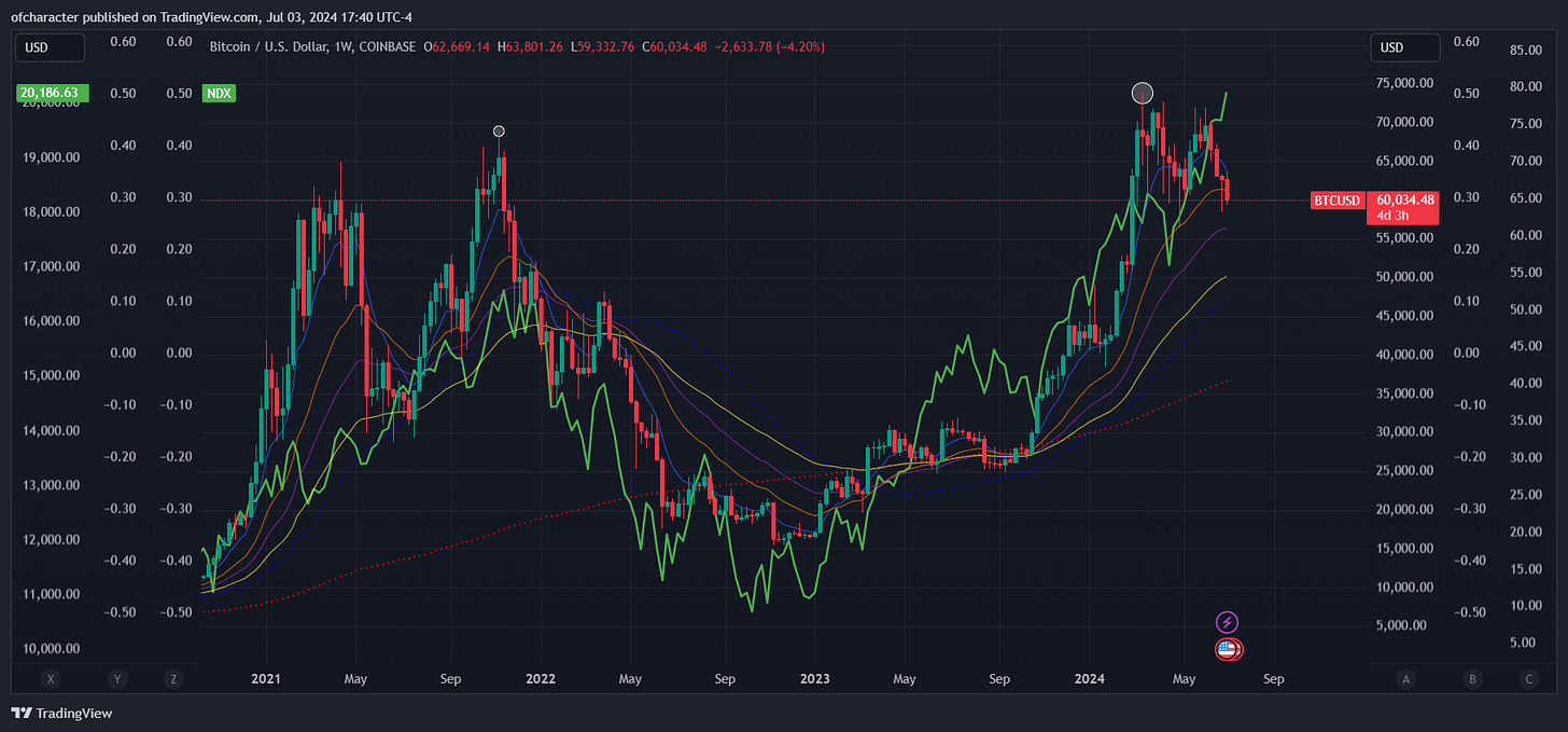 Back in November 2021, the consensus was that bitcoin was going straight to 100k. This clearly didn’t happen, and if you look closely, you’ll see that bitcoin topped earlier than NDX did — and much earlier than SPX. This time around, both SPX and NDX have well eclipsed their ATHs while bitcoin’s performance has been lackluster, failing to make new ATHs. Nonetheless, 100k is the consensus again, and I’ll happily take the other side of this. Why? Because it’s time for summer madness. Aside from what I’ve written about in the last 3 editions of this, this is what that summer madness looks like for equities. Along with this…