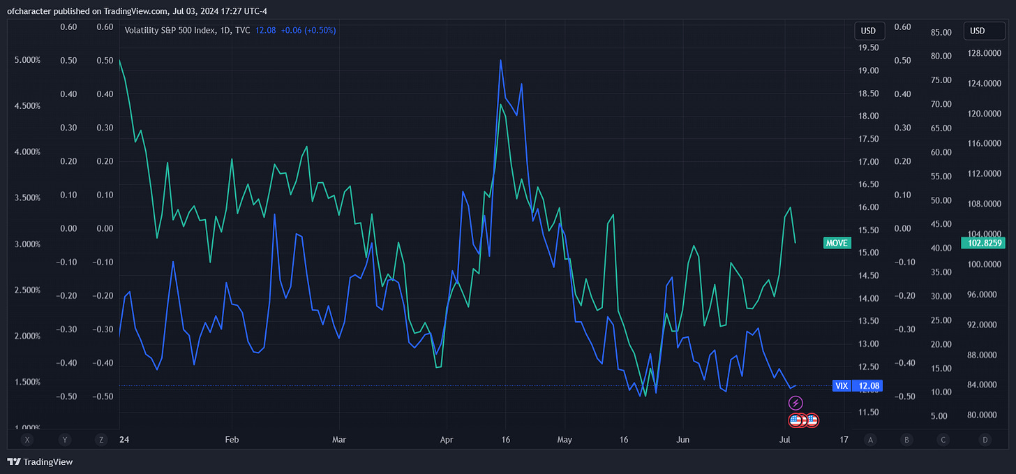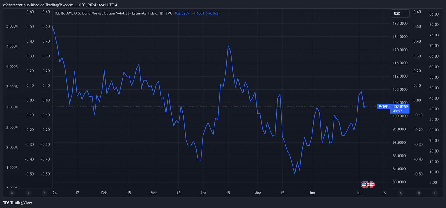 rate vol looks to have bottomed late May. I think around 140 on MOVE 0.00%↑ is the area where you start to hear more widespread fears about systemic failure, so no panicking is warranted right now — or ever, but if you’re going to panic, be first.