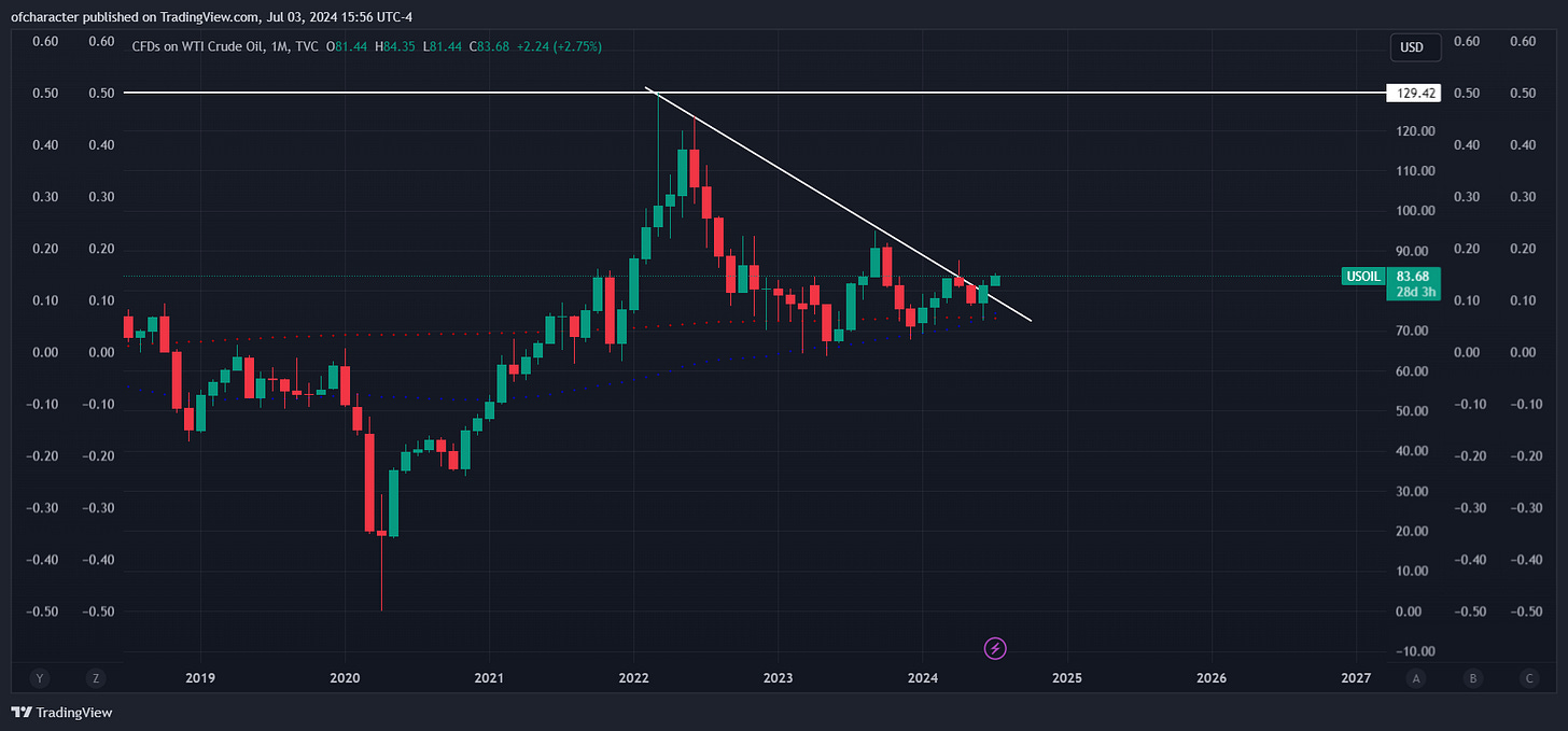 Immediately my mind goes to the SPR — formerly known as the Strategic Petroleum Reserve, now known as the Strategic Political Reserve. An overlooked outcome in this scenario is one where, in the face of humiliating defeat, the current admin sees no incentive to tap the SPR anymore. Looking at oil now from both a fundamental and positioning perspective, there may be more upside than previously expected.