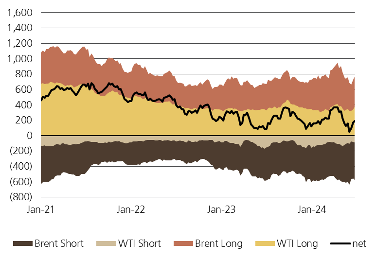 The last image makes it clear that despite the recent short covering and substantial rally in crude, net length is still fairly short — notably far from where oil has previously made interim peaks.