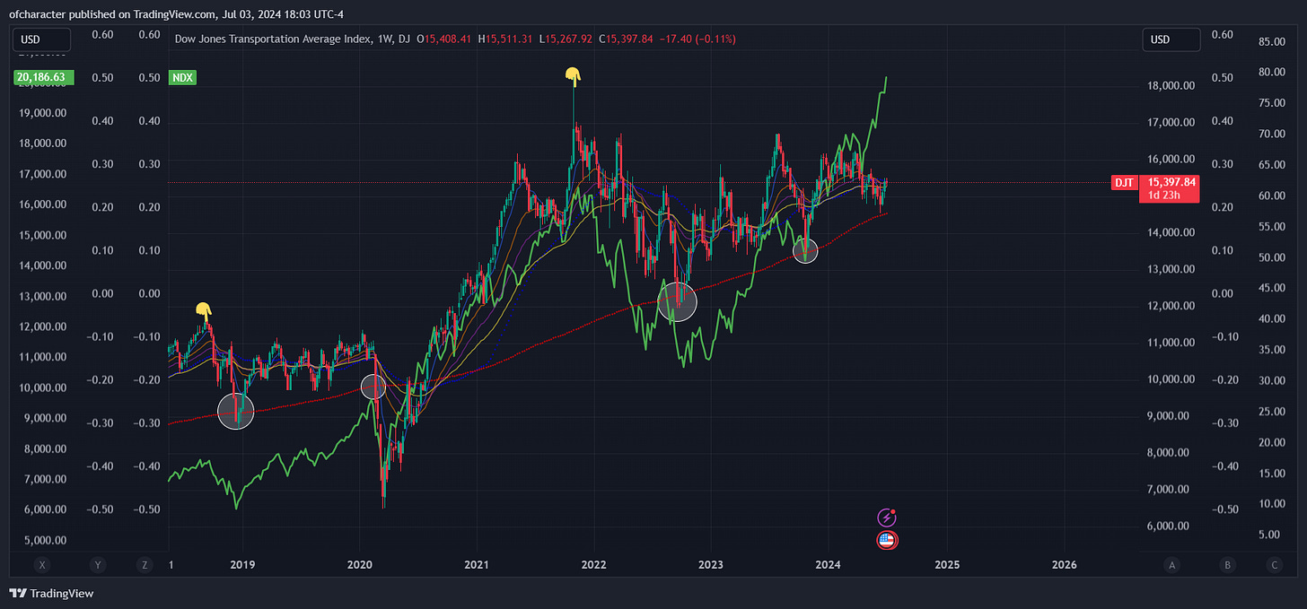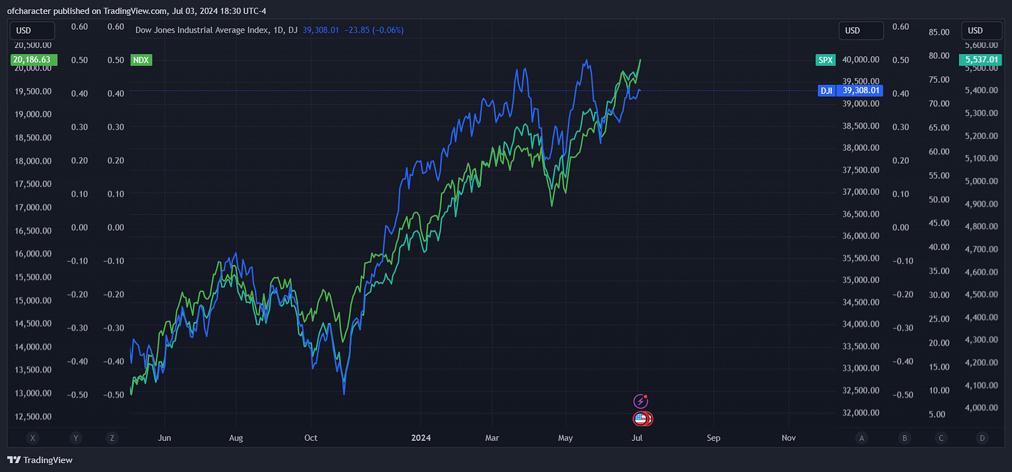 Dow Theory, which I’ve mentioned plenty of times since late May, is still signaling major weakness for the indices in the future. Notably, the Dow hasn’t made new highs after the weakness in April like the other indices.
