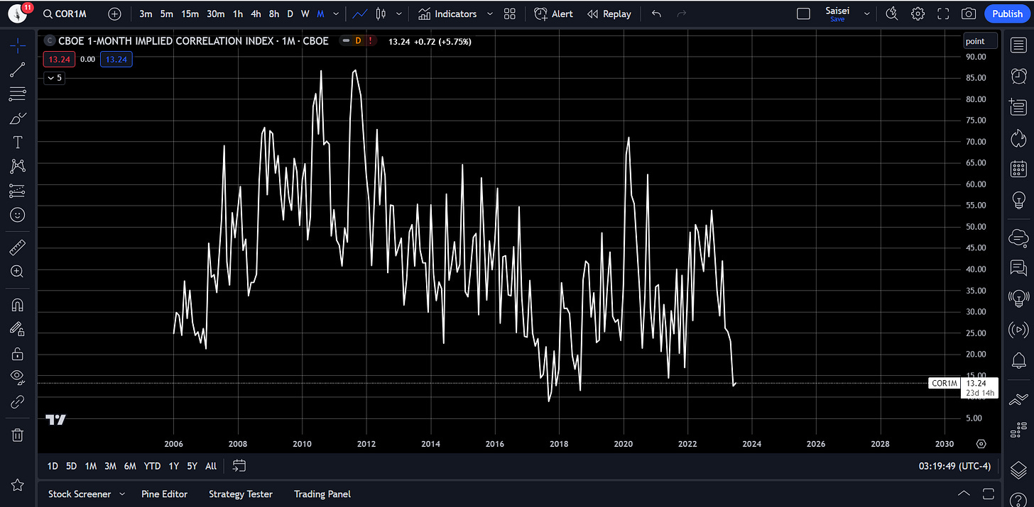 Right now, implied correlation is historically low which means that while index vol looks low (VIX 14), individual stocks in the index are quite volatile. In other words, half of the index can rise while the other half falls — essentially obscuring index level vol. A modest increase in implied correlations will drive index vol higher — so no need for a black swan.